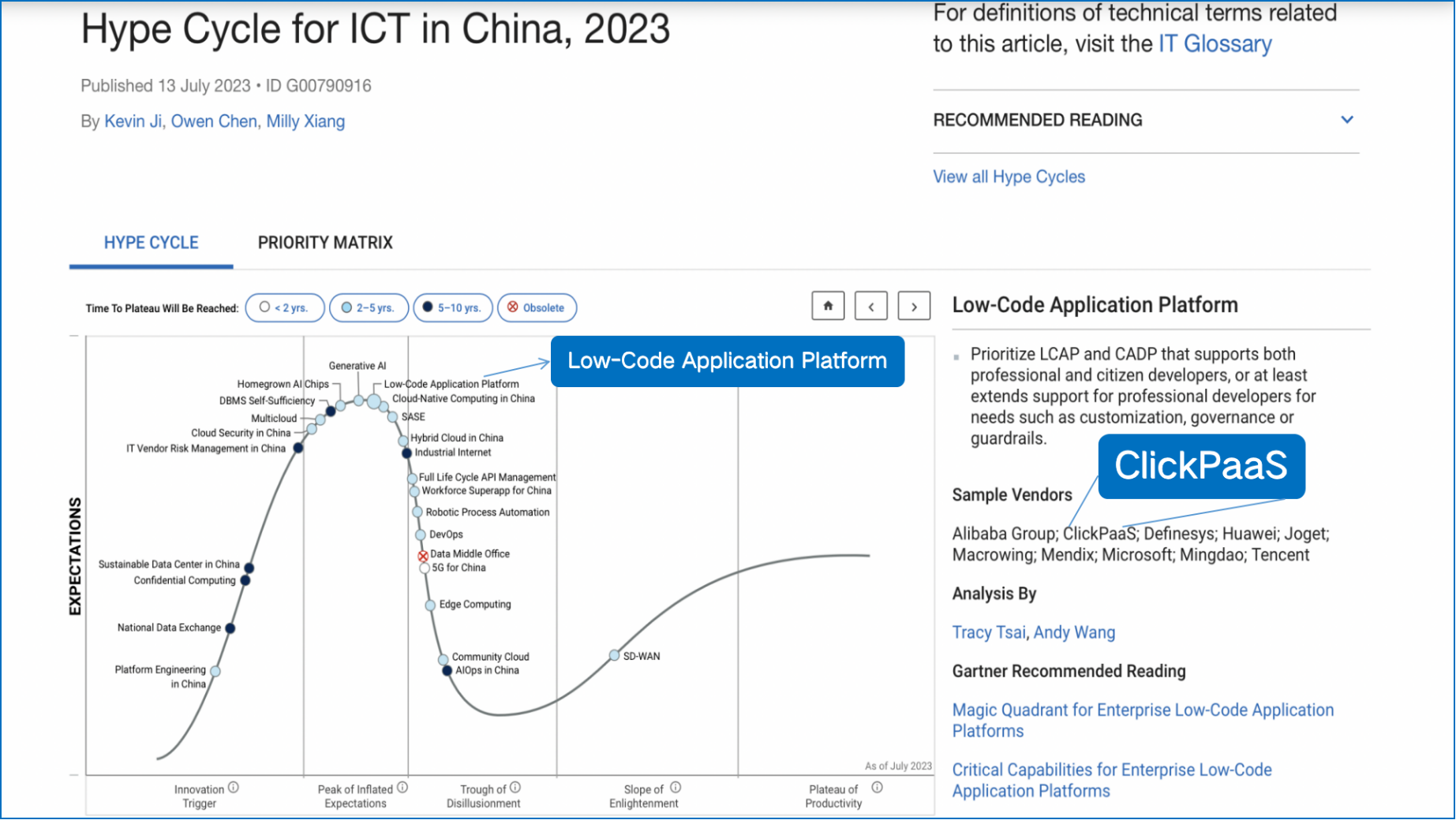 近日,国际权威研究机构Gartner发布了《Hype Cyple for ICT in China,2023(2023年中国ICT技术成熟度曲线)》报告,金年会官方在线登录凭借平台的aPaaS+iPaaS+DaaS保障业务系统的一站式设计,多租户、热发布、国际化、信创安全等特性实力登榜,并作为低代码PaaS平台代表厂商TOP2入选本次报告。